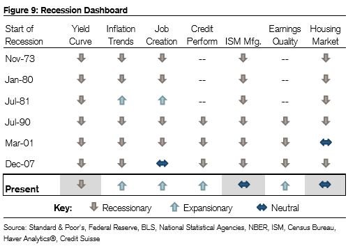 Last week, the U.S. bond yield curve inverted, a phenomenon that historically presages a recession. That was the only one of the seven major indicators Credit Suisse tracks to signal a downturn. In past recessions, indicators like inflation trends, job creation, credit performance, ISM manufacturing, earnings quality and the housing market were all showing weakness.